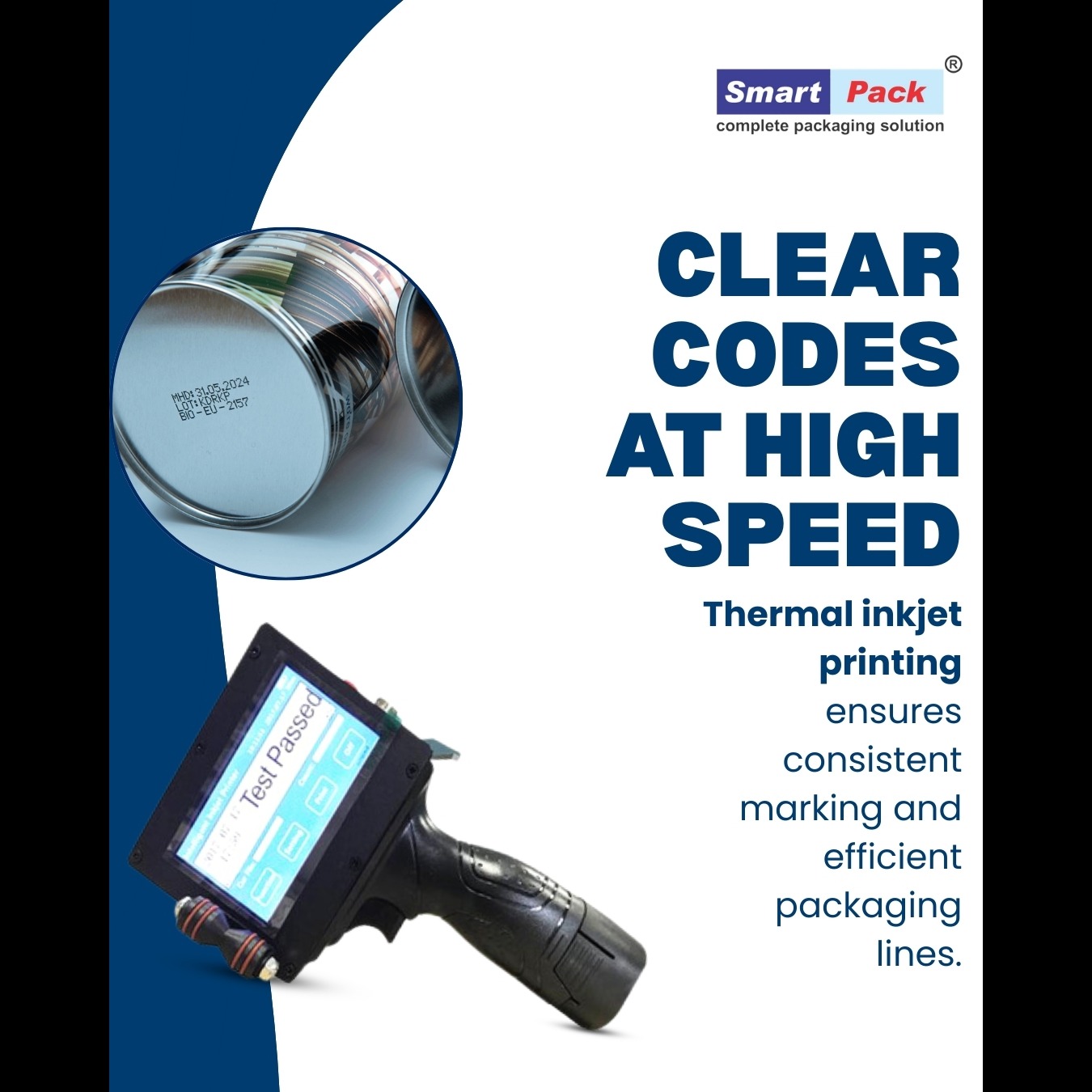 This flyer showcases a high-speed Thermal Inkjet (TIJ) printing solution from Smart Pack. It’s designed for industrial environments where speed and legibility are critical for compliance and tracking. Here is a breakdown of the key information provided: Core Benefits: High-Speed Performance: Specifically engineered to keep up with fast-moving packaging lines without sacrificing print quality. Precision Marking: Delivers “Clear Codes“ (as seen on the metal can base in the image), which is essential for expiry dates, batch numbers, and barcodes. Efficiency: Promotes consistent marking to reduce errors and downtime in the packaging process.