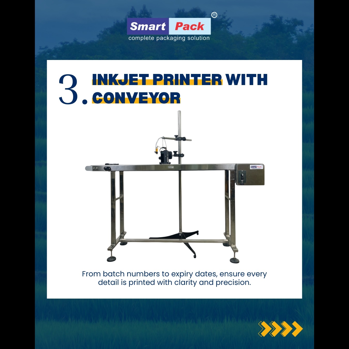Ensure 100% traceability and regulatory compliance with the Smart Pack Online Inkjet Coding System. In a competitive market, clear and accurate printing of batch numbers, manufacturing dates, and expiry dates is essential. Our high-speed inkjet printer is specifically designed to integrate into your production line for seamless, non-stop coding. Equipped with a heavy-duty stainless steel conveyor, this system ensures that every bottle is printed with absolute clarity and precision, regardless of production speed. Why This Printing System is Essential: Crystal-Clear Precision: High-resolution printing ensures that your batch numbers and expiry dates are legible and professional. Continuous Online Coding: No need to stop the line. The printer works in real-time as bottles move along the conveyor. Versatile Application: Easily print on various surfaces including plastic (HDPE/PET), glass, and metal. Easy to Use: User-friendly interface allows for quick changes to batch details and date formats, minimizing downtime between shifts. Key Specifications: Function: Printing Batch Numbers, MRP, Manufacturing Date, and Expiry Date. System Type: Online Inkjet Printer with Integrated Conveyor. Build Material: Durable stainless steel for long-term industrial use. Ideal For: Pesticides, Agro-chemicals, Pharmaceuticals, and Food & Beverage packaging. Maintain 100% Traceability with Smart Pack Protect your brand and stay compliant with the latest industrial standards. Trust Smart Packaging Systems for reliable, high-speed coding solutions. 📞 Call/WhatsApp: +91 9109108483 🌐 Website: www.smartpackindia.com 📍 Location: Indore, Madhya Pradesh Inkjet Printer with Conveyor, Industrial Batch Coder, Expiry Date Printing Machine, Online Coding System India, Pesticide Bottle Printing, Smart Pack Indore, Batch Coding Machinery, MRP Printing Machine.