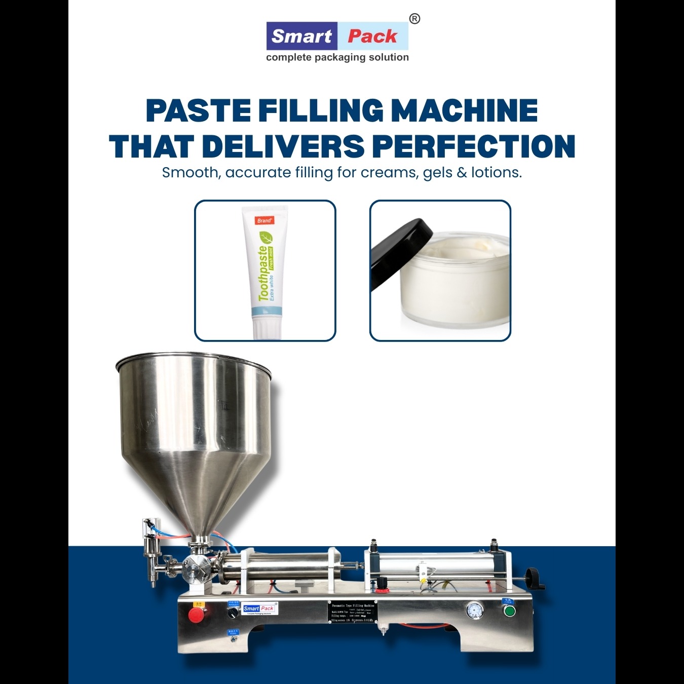 Smart Pack Paste Filling Machine Achieve perfection in every fill. Whether it's cosmetics, pharmaceuticals, or food pastes, our machine delivers the accuracy your brand deserves. Best for: Creams, Gels, and Lotions. Operation: Pneumatic-based for consistent performance. Quality: “Complete Packaging Solution“ by Smart Pack.